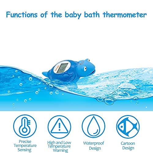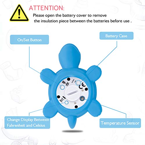 – User-friendly: instantly activates in water.- Easy to grasp, also a safe and funny bath toy for children and parents to enjoy bath time.- Waterproof, Quick and Accurate: scan the water temperature every second and displays on easy-to-read LCD screen.- Superior safe design: built-in battery. One-piece design. At least 1 year of battery lifespan without replacement.- Temperature Alarm: